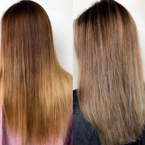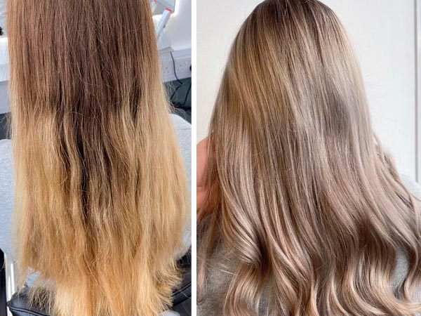Caso 3: antes y despues de usar el toner Wella t18 en un cabello con balayage